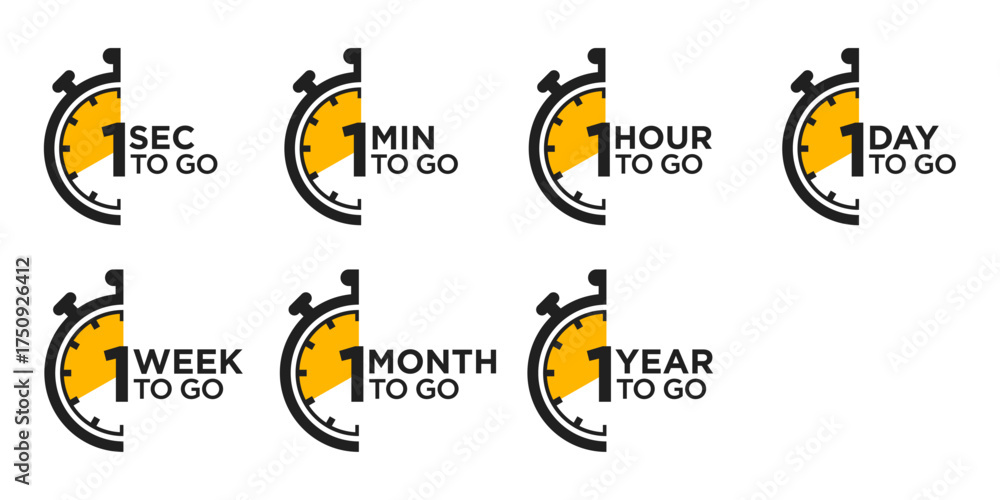 Last countdown icon set. 1 second, minute, hour, day, week, month, and year to go icons. Vector illustration. #1750926412