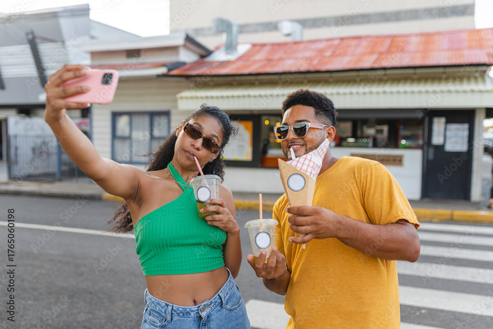 Latino friends taking a selfie and enjoying street food on a sunny day #1765060198