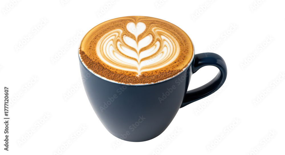 Latte art in a blue cup isolated on transparent background, coffee with heart shape #1777120607
