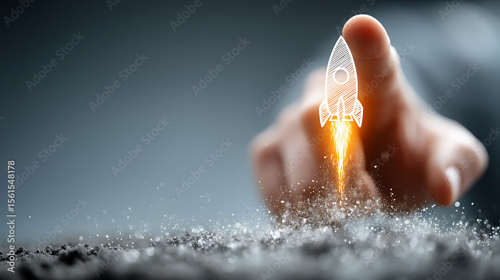 Launching business startup rocket with hand gesture beginning a financial venture new project futuristic innovation successful enterprise digital strategy idea and investment #1561548178
