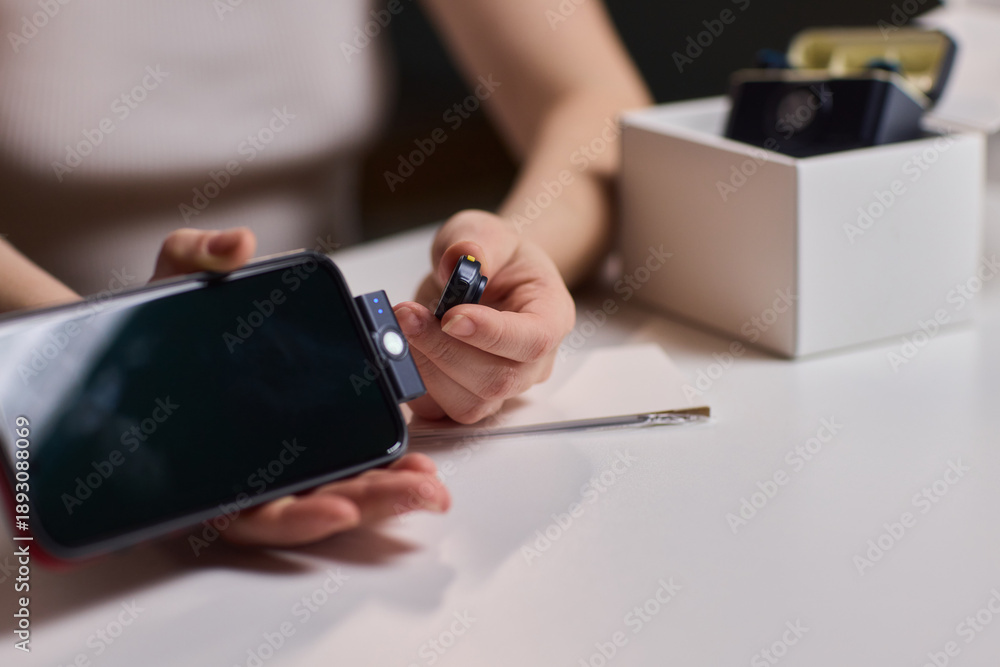 Lavalier attachment to phone for rapid interview recordings. Onsite interview preparation involving portable microphone and quick assembly tools in natural lighting conditions #1893088069