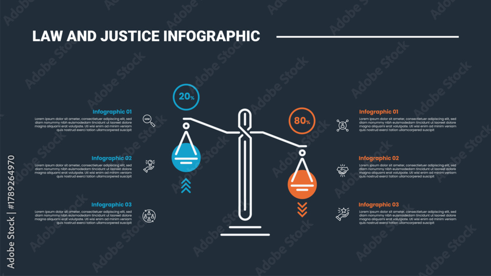 Law and justice infographic process diagram with scales center with content opposite direction with dark background bright outline style 6 points #1789264970