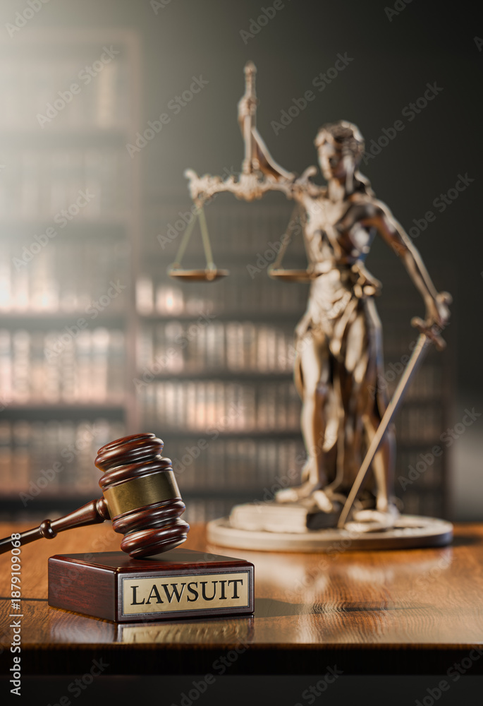 Lawsuit: Judge's Gavel as a symbol of legal system, Themis is the goddess of justice and wooden stand with text word on the background of books #1879109068