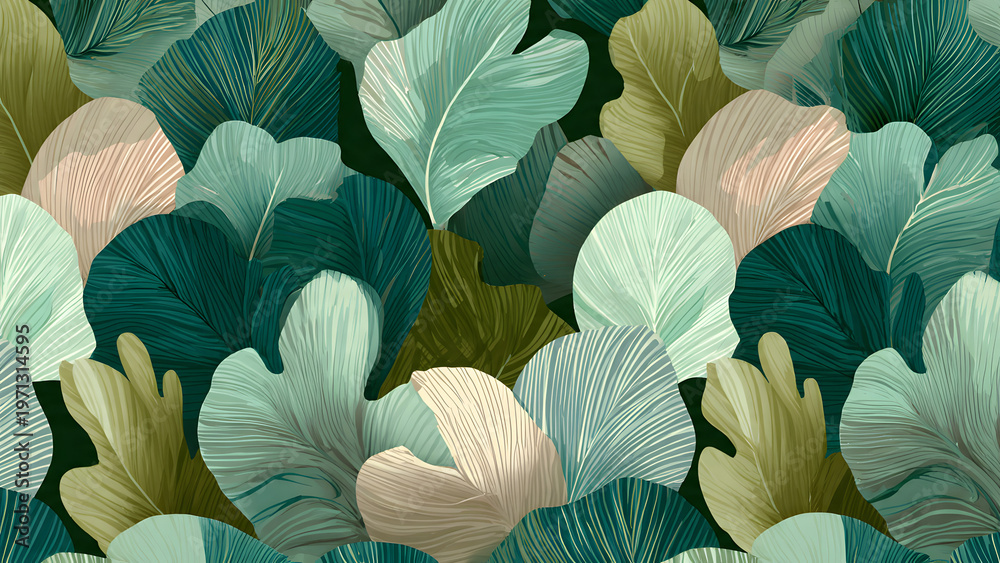 Layered tropical foliage pattern in soft muted greens with clean line work and flat shading, ideal for tropical design, wallpapers, and botanical illustration #1971314595