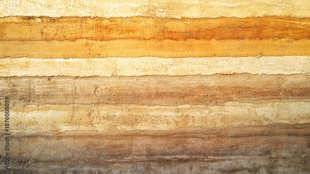 Layers of earth and soil are visible, revealing different shades of brown and gold tones in the ground of a field showing textures and sedimentary patterns. #1876008039