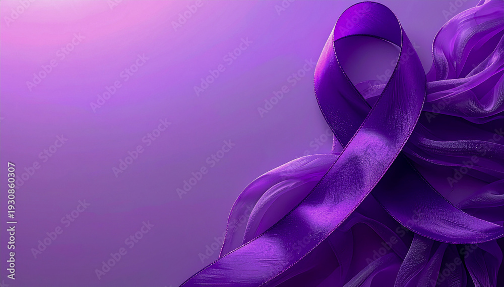 Lazo morado de satén brillante, símbolo del Día Internacional de la Mujer (8M). Representa igualdad, derechos y justicia social. Imagen elegante ideal para campañas y comunicación institucional. #1930860307