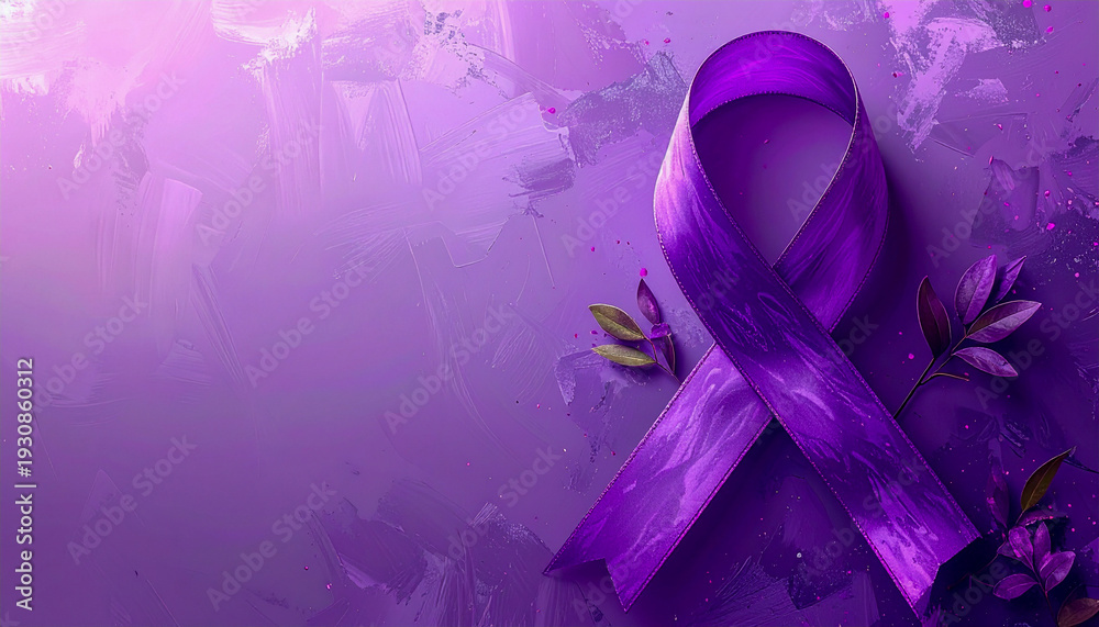 Lazo morado de satén brillante, símbolo del Día Internacional de la Mujer (8M). Representa igualdad, derechos y justicia social. Imagen elegante ideal para campañas y comunicación institucional. #1930860312