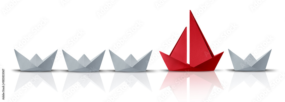 Leadership Beyond Ordinary as a group of ordinary paper boats and thinking out of the box as a game changer with disruptive new creative technology as a leader changing the status quo. #1803833067