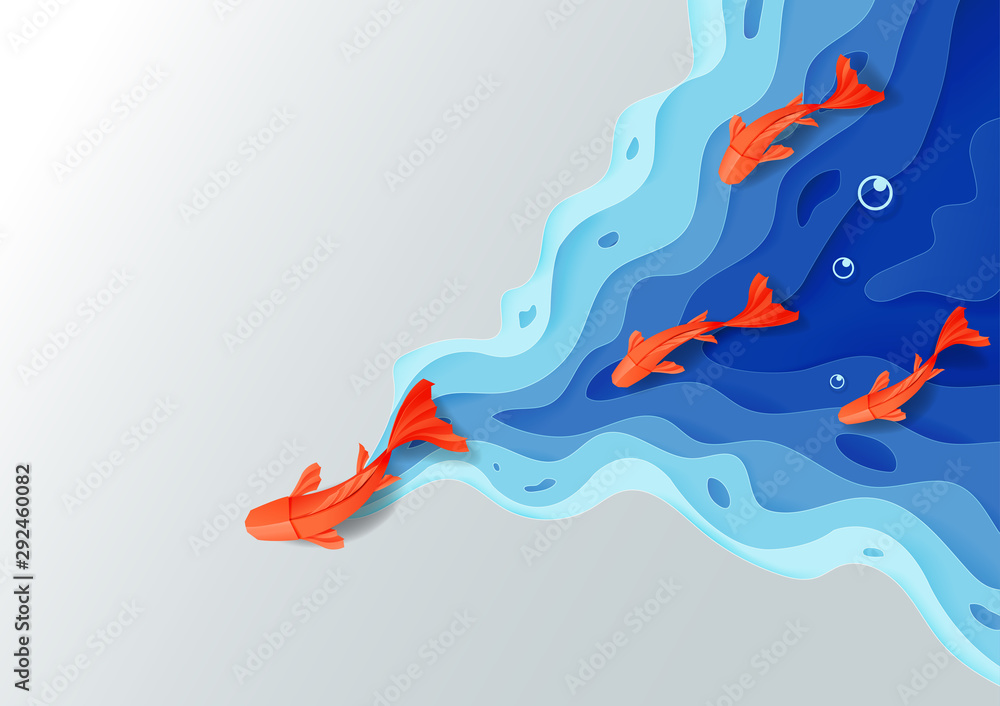 Leadership concept, Origami red orange paper fish on blue water polygonal trendy craft style, Paper art design background #292460082
