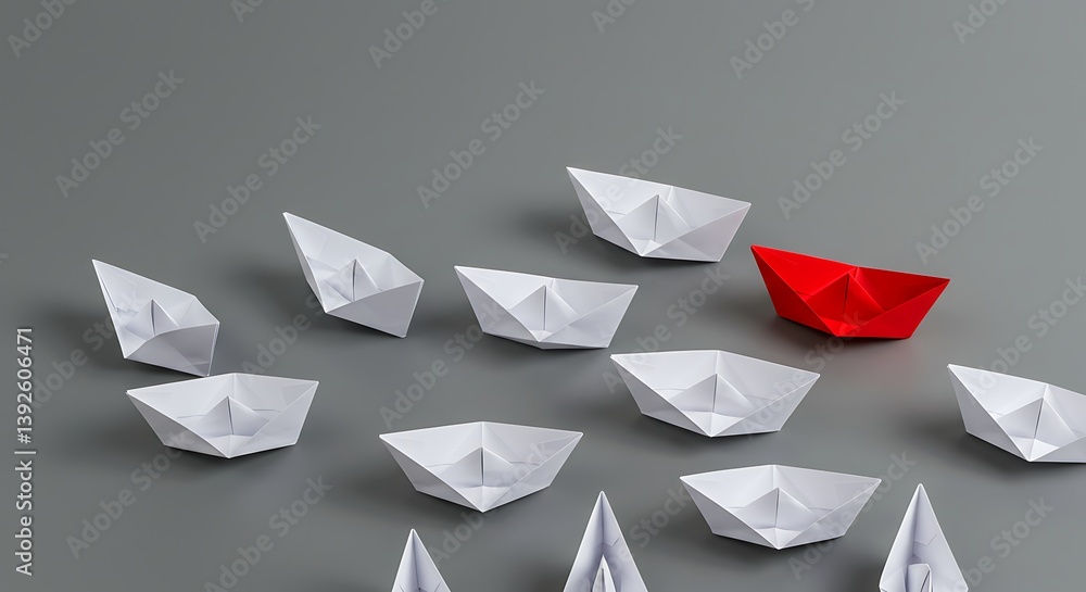 Leadership, successful business startup or competitive advantage theme. A red paper boat distinguishing itself from a sea of white boats. #1392606471