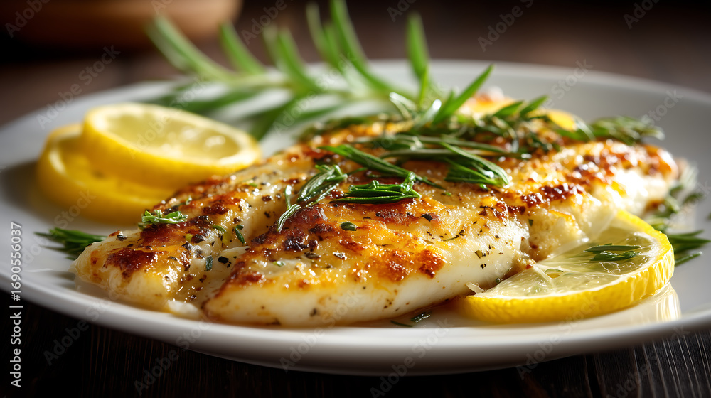 Lemon tilapia fillet served with herbs on plate, concept of seafood and healthy meal #1690556037