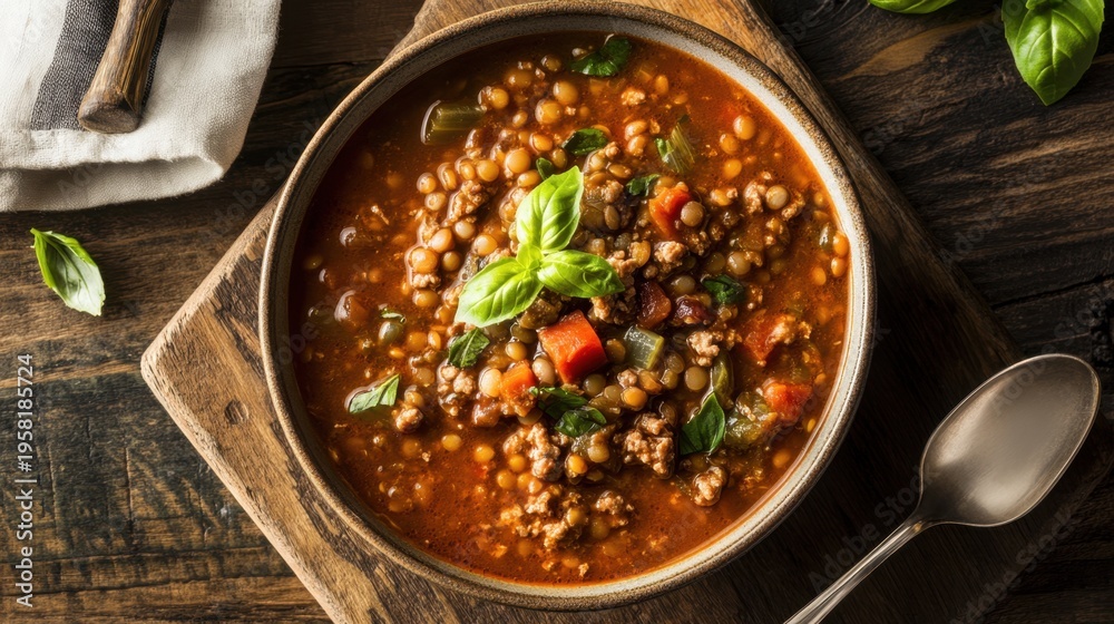 Lentil and beef soup served in bowl on wooden board #1958185724