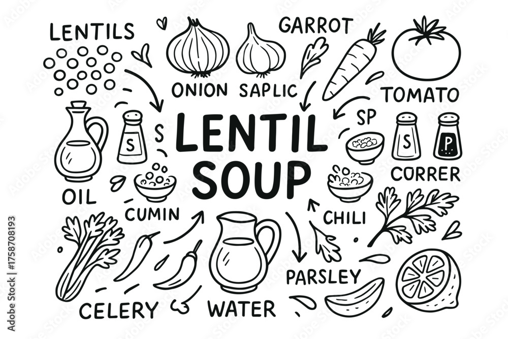 Lentil soup recipe elements illustration with vegetables and spices #1758708193