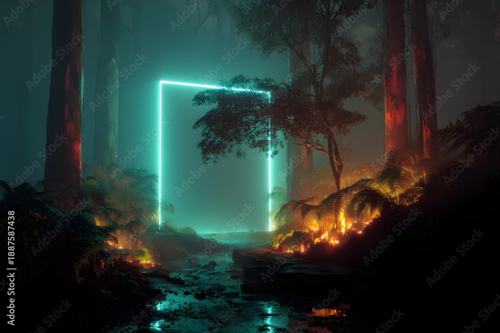 Leuchtendes Neonportal im mystischen Wald bei Nacht #1887587438