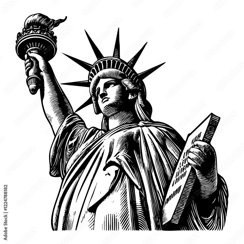 Liberty statue sketch engraving black and white outline. Scratch board imitation. illustrated in vintage line art style on a white background. #1224788182