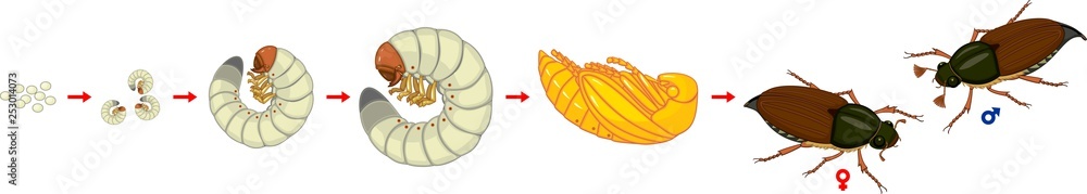 Life cycle of cockchafer. Sequence of stages of development of cockchafer (Melolontha melolontha) from egg to adult beetle #253014073