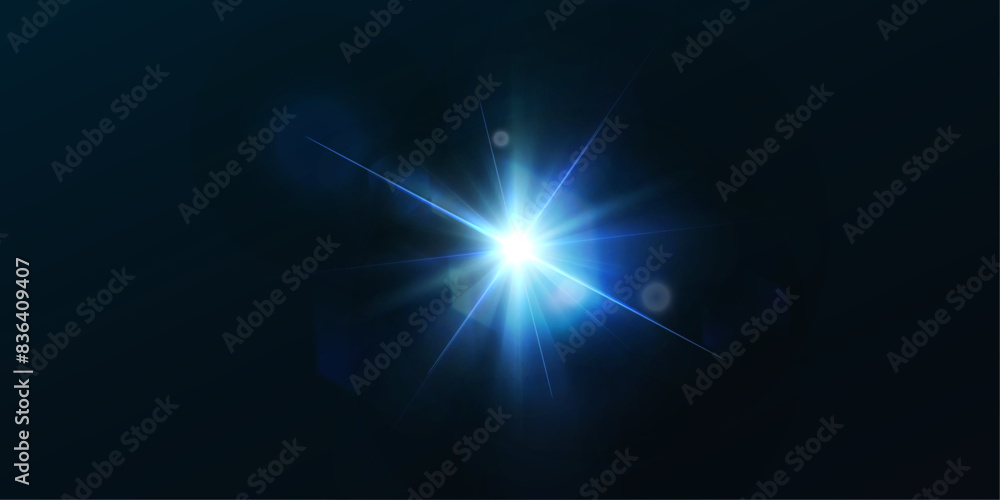 Light effect of blue glowing light. Solar flare. Glow effect. Starbursts with twinkling highlights. Beautiful light effect of flickering highlights. Vector 10 EPS #836409407