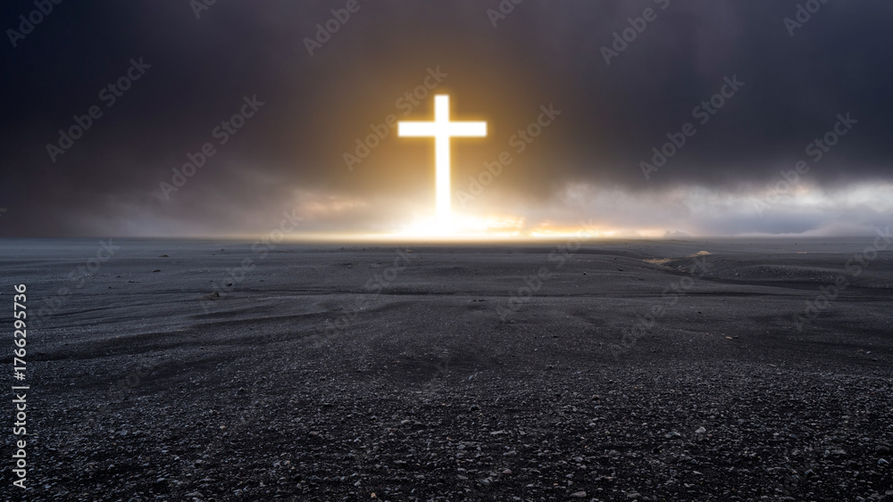 Light of the Christian cross with barren landscape and dark dramatic sky background. Concept of Christianity, religious, faith, Jesus, or belief #1766295736