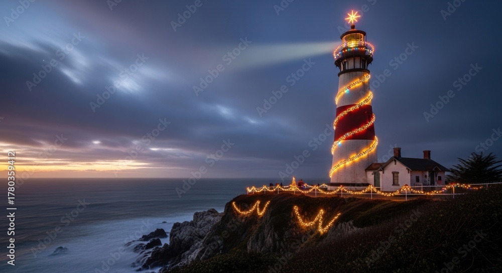 Lighthouse adorned with christmas lights stands tall against the ocean at twilight #1780359412