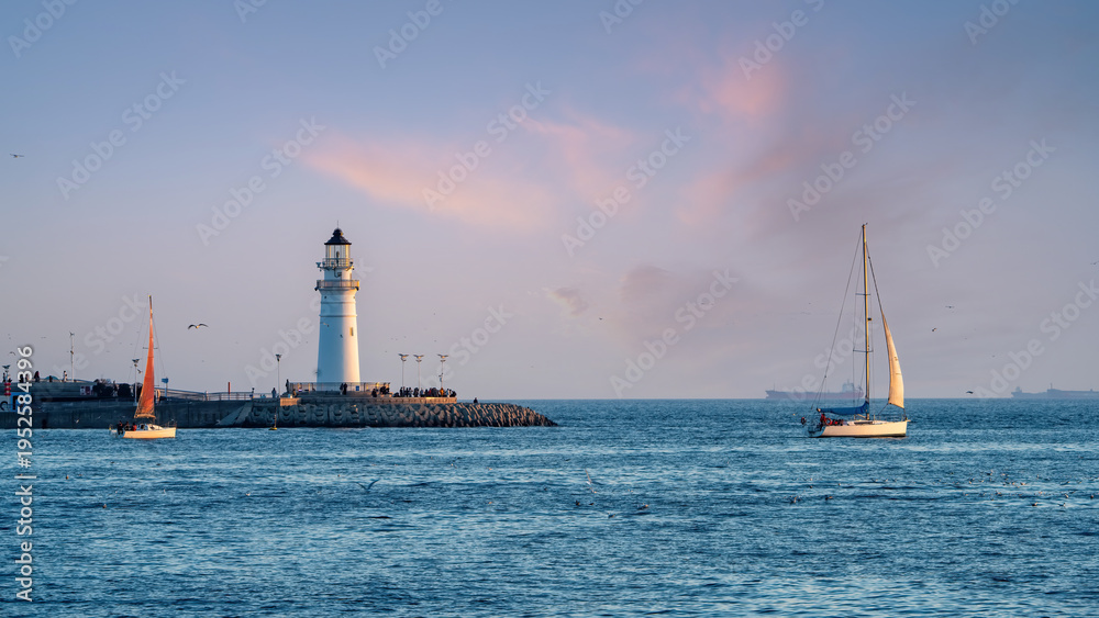 Lighthouse on Pier with Sailing Boats at Sunset #1952584396