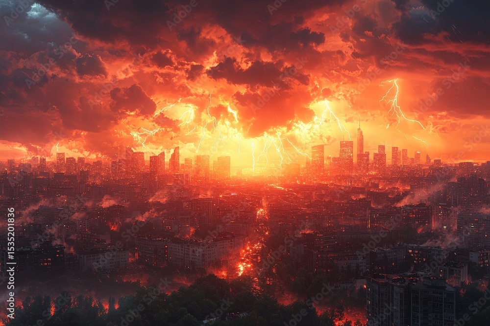 Lightning storm over city, flash over city cataclysm landscape panorama #1535201836