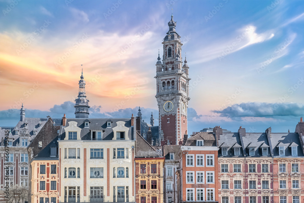 Lille, ancient houses in the center, and the belfry of the Chambre de Commerce #660795435
