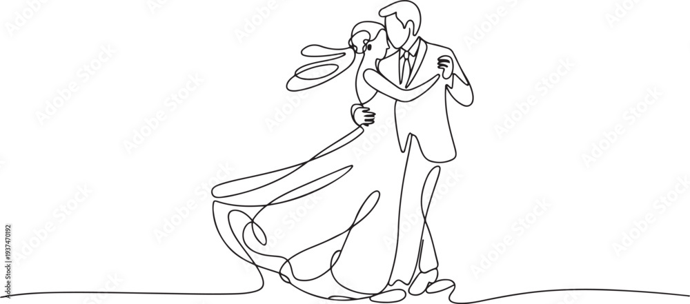 Line art drawing wedding couple married man and woman dancing on the floor at party park. Romantic young man and woman holding hands and spinning around. one line Icon drawing #1937470192