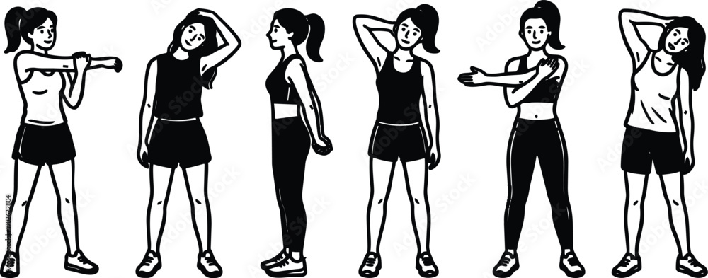 Line art sequence of female stretching exercises in sportswear side view front view varied poses shoulder and neck stretches gym warm up routine simple monochrome illustration #1902622804