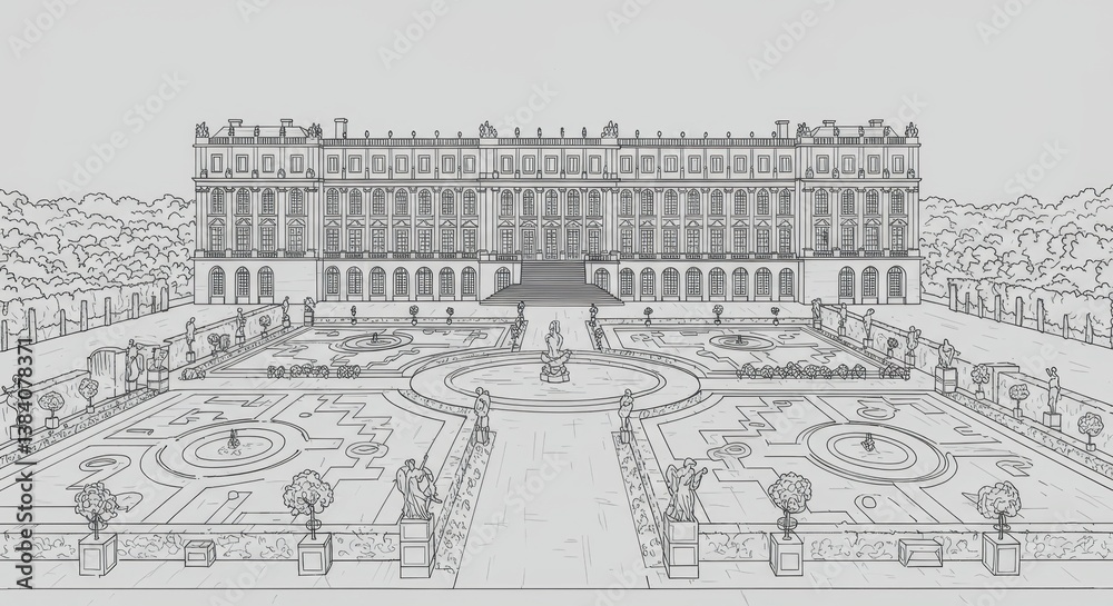 Line Drawing of Palace of Versailles Facade and Gardens #1384078371