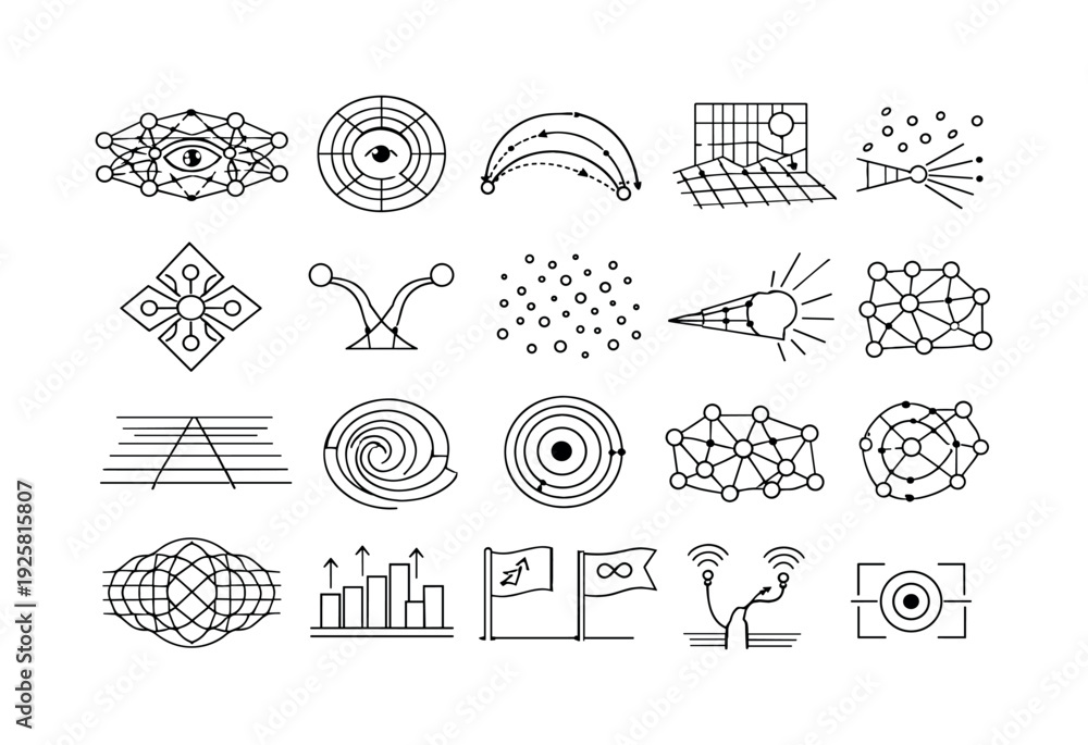 Line vector icons of investigating simulation plausibility while embedded: perception-channel nets, inference zones, causal-limit #1925815807