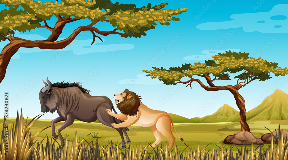 Lion and wildebeest in nature backgroud #374230621