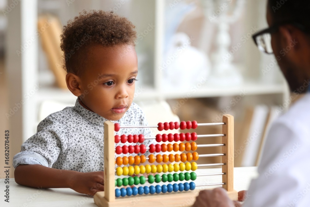 Little African curly boy playing with colorful abacus in psychologist's office. Concept of child development and helping children with mental disorder #1682078483