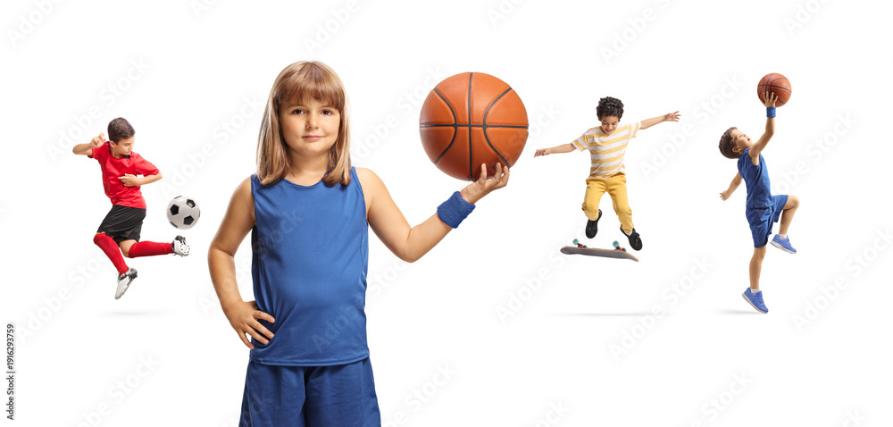 Little girl holding a basketball and boys playing sports in the back #1916293759