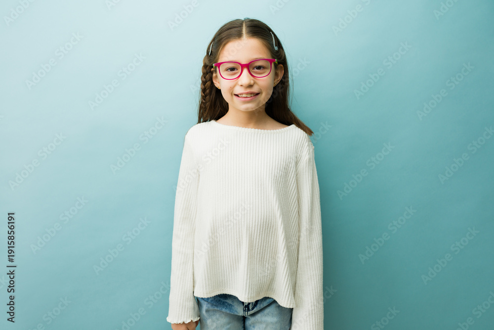 Little girl smiling and having fun. Happy child wearing corrective eyewear, promoting vision health and smart learning #1915856191