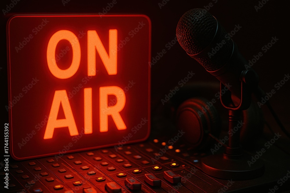 Live streaming studio, on air audio. Illuminated "ON AIR" sign with a microphone and audio mixer, indicating a live broadcast. #1744155392