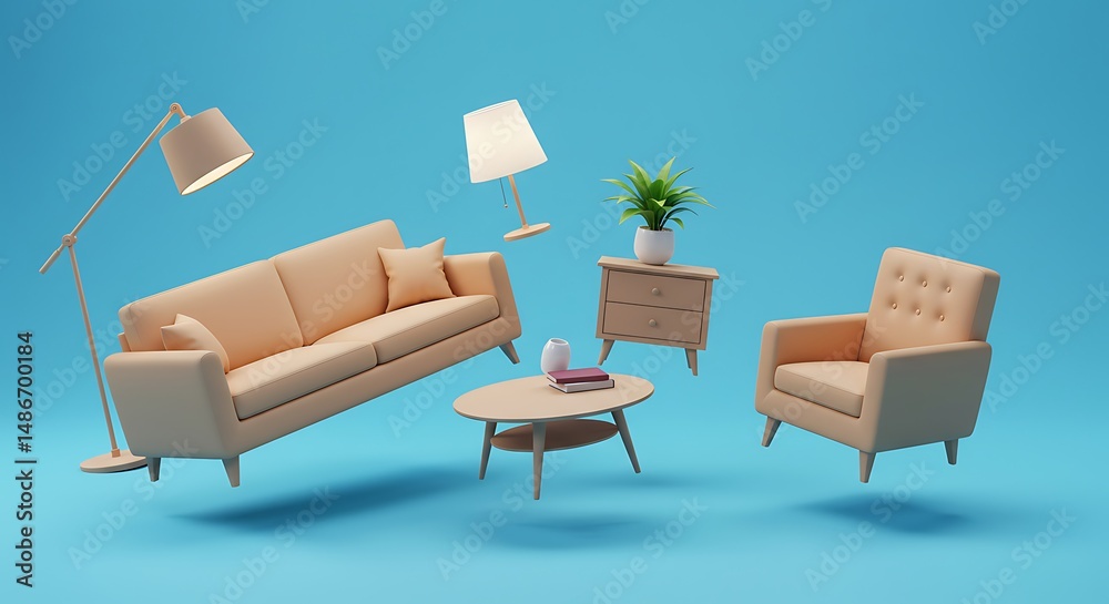 Living room furniture floating against a blue background, symbolizing creativity and home decor concepts. 3D rendering perfect for interior design or advertising visuals. #1486700184