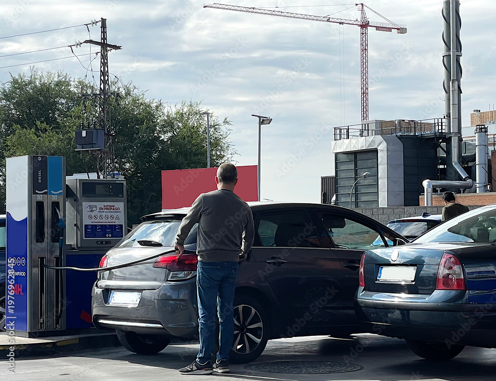 Llenar depósito de coche en gasolinera con manguera y gasolina de surtidor self service con precio por subida de barril de petróleo en guerra #1976962845