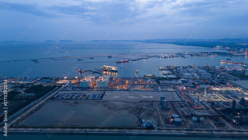 LNG (Liquified Natural Gas) tanker anchored in Gas terminal gas tanks for storage. Oil Crude Gas Tanker Ship. LPG at Tanker Bay Petroleum Chemical or Methane freighter export import transportation #1770292234