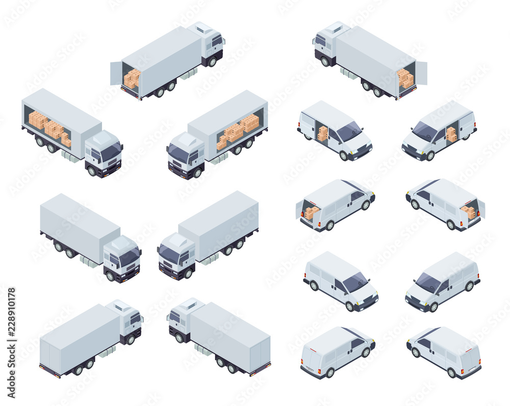Loaded Cargo Vehicles Isometric Vector Icons Set #228910178