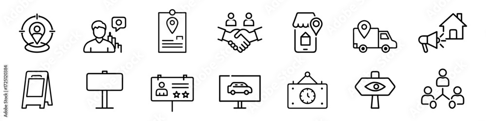 Local Marketing and Signage Line Icons – Geotarget, Storefront, Delivery, Billboard Vector Set #1725120384