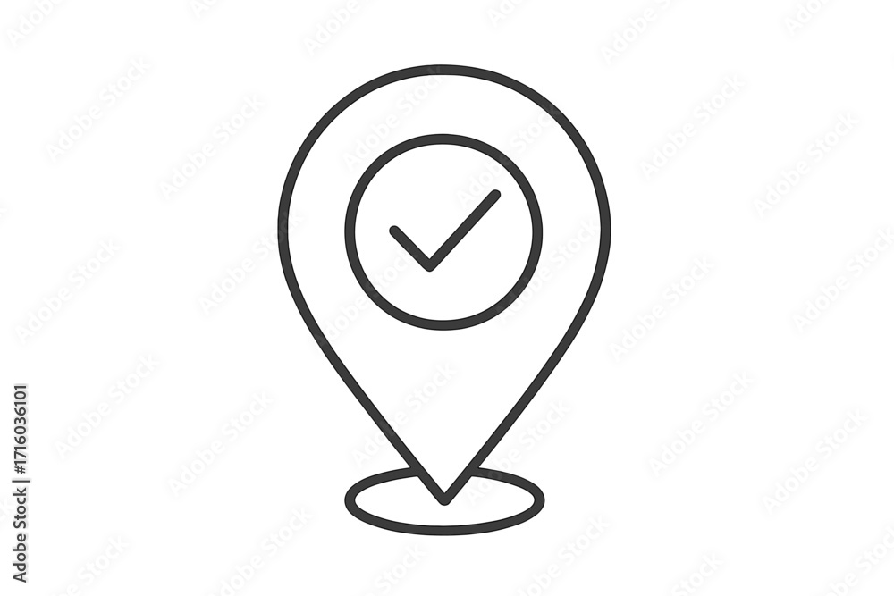 Location pin with check mark line icon. GPS navigator pointer, map marker symbol. Concept of destination confirmed, arrival, check in, correct place, verified address. #1716036101