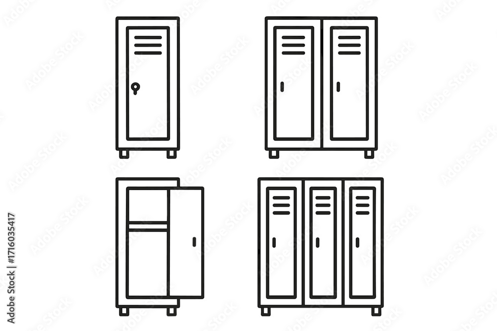 Locker icon set. School, gym, or work metal storage cabinets. Line art vector illustration for changing room, security, and personal belongings. Simple outline graphic symbol. #1716035417