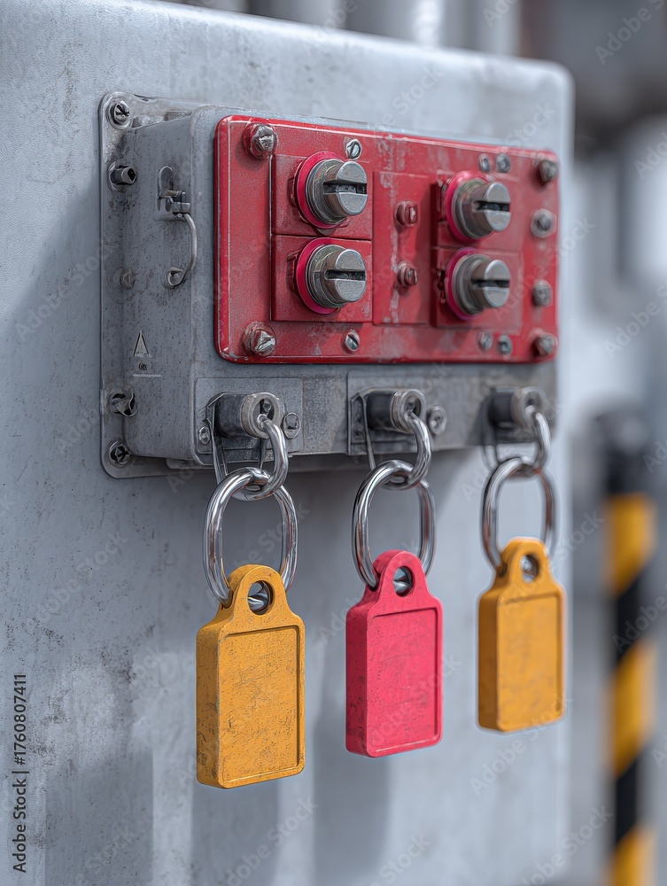 lockout tagout device with padlocks and tags securing an industrial power switch essential for workplace safety maintenance procedures and compliance #1760807411