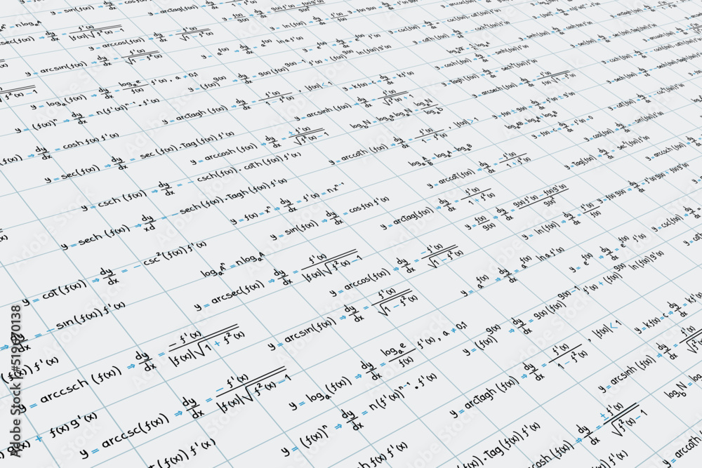 Logarithmic, derivative, trigonometric, logarithmic, hyperbolic and inverse equations and formulas on perspective grid background #519670138