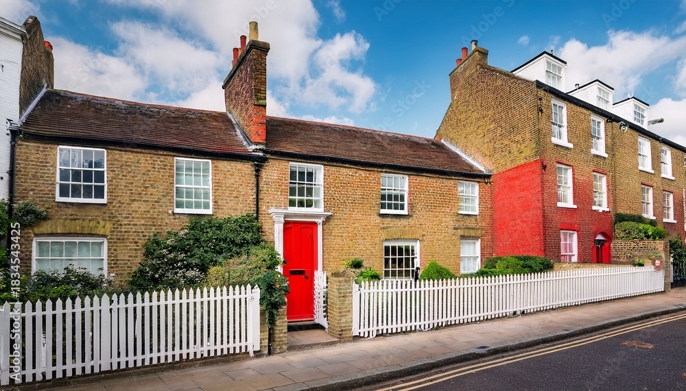 london typical house with brick wall red door and white fence #1834543425