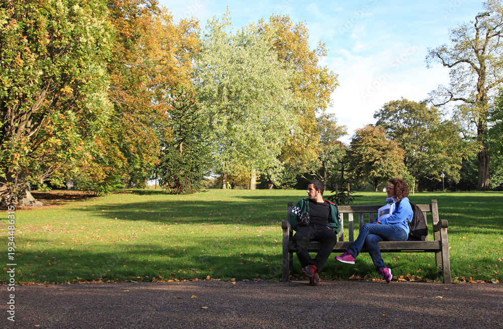 londres pareja de jóvenes chico y chica turistas sentados en un banco de madera de un parque céntrico para descansar IMG_2437-as26 #1934486315