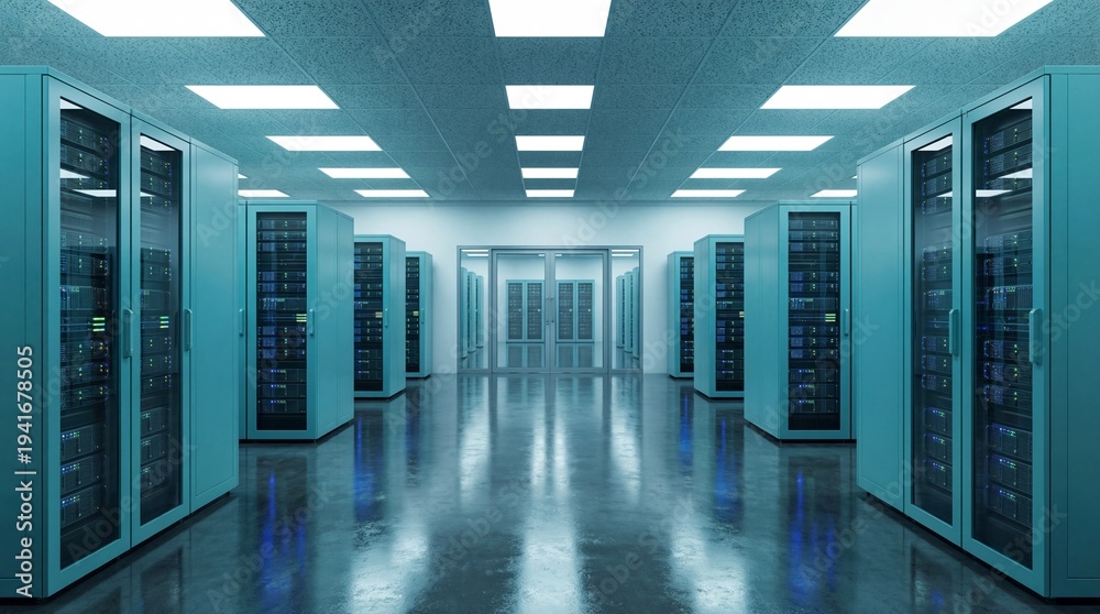 Long dark server room corridor with rows of computer racks data center #1941678505