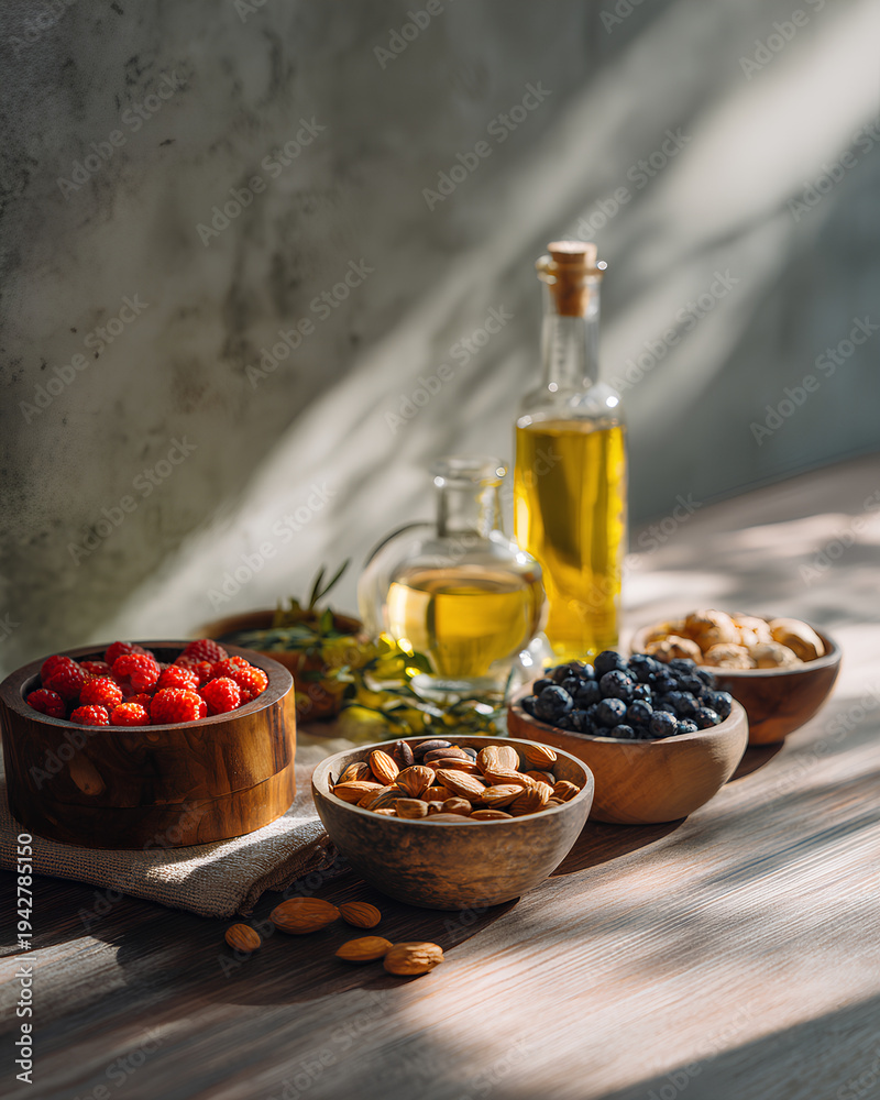 Longevity superfoods display with berries greens nuts and olive oil on wooden table wellness nutrition concept #1942785150