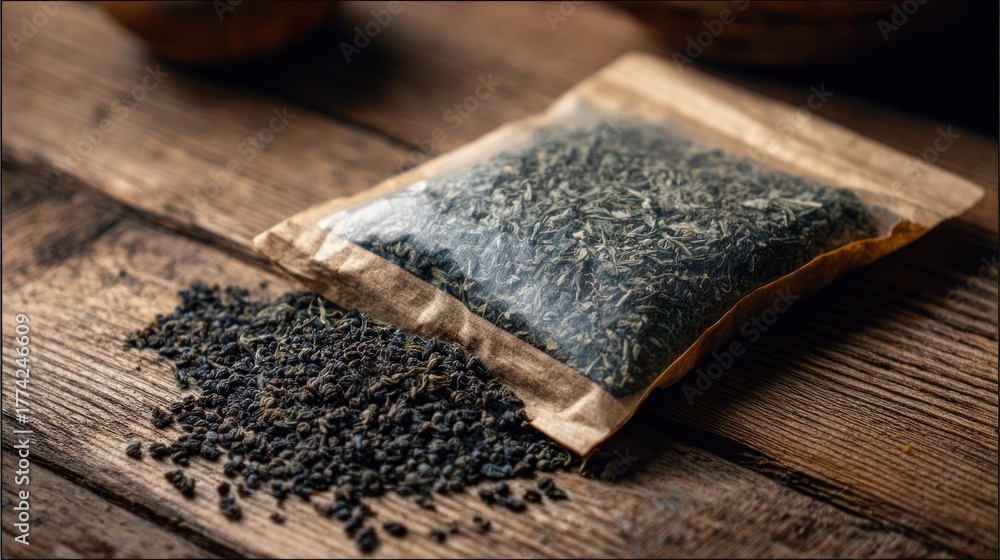 Loose leaf tea in a paper bag on a rustic wooden surface #1774246609