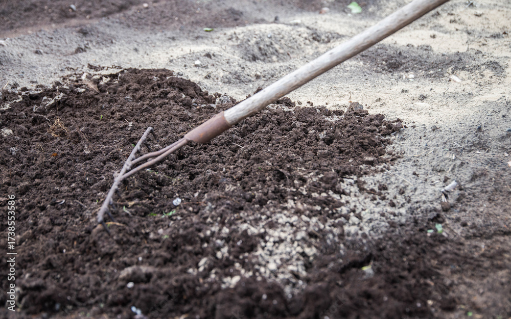 Loosening the soil with a rake and deoxidizing the soil with dolomite flour in the garden in spring, close-up. Copy space for text, neutralizing soil #1738553586